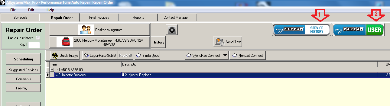 The two tools appear at top right on the Repair Order tab. They will NOT appear until the Carfax services license agreement has been digitally signed either when AllsystemsMax PRO loads, or from File menu->Carfax Services.