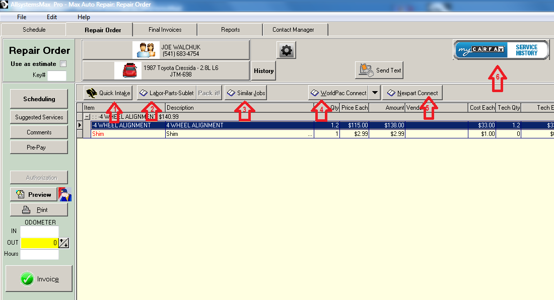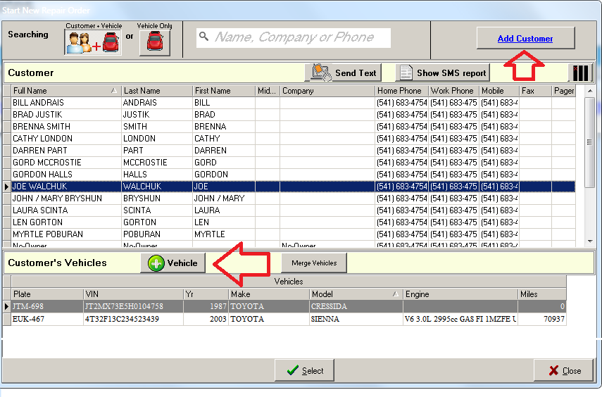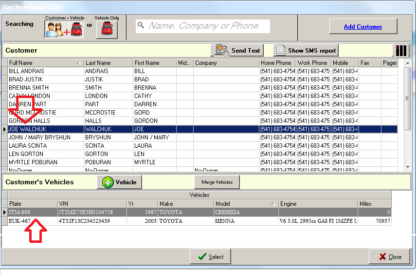 Then you highlight a customer in the Start New Repair Order windows, and one of the customers vehicles...