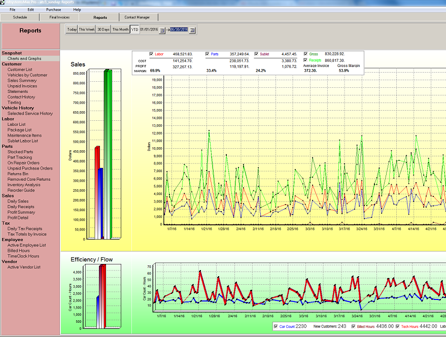 Charts and graphs will display the key indicators for your business, for the selected date range.
