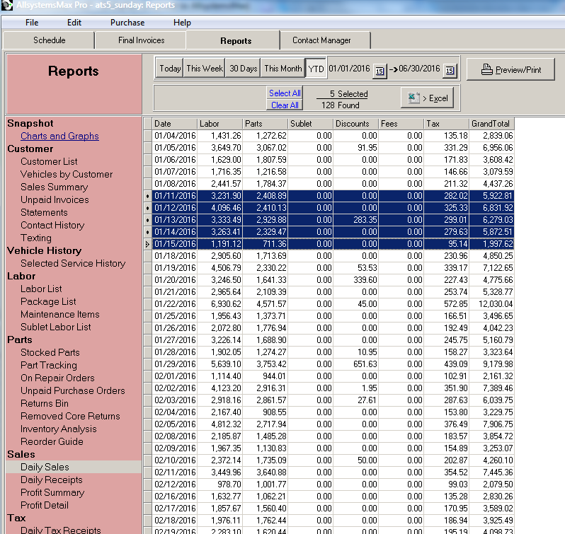 Records are selected for printing or previewing in a formatted report by clicking the 'Select All' button, or click on single lines. Hold the Control key down and continue clicking to select more lines. Or, hold the Shift key down and click the beginning of a sequence of lines, followed by a click at the end of the sequence. In the cut out above, the records for the second week of January are selected.